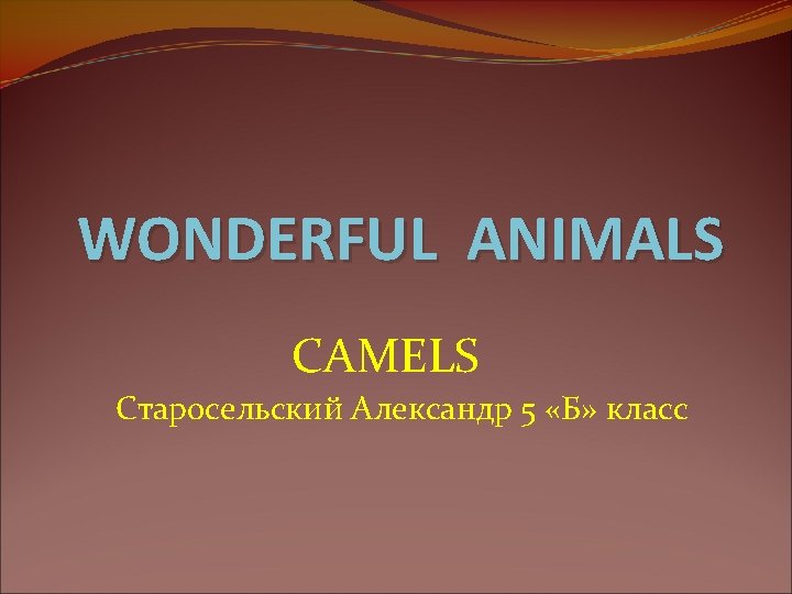 I want to tell about this interesting animal – a camel. A camel is a long-legged animal with a big body, a little head, little ears and a long tail. Its fur is yellow and brown.