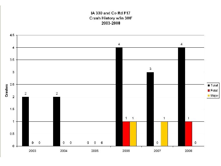 IA-330 & F-17 Collision Diagram 2003 - 2008 Total = 15 or 2. 50/year 2 Fatal 8 Injury 5 PDO 15 Right-Angle (100%) 11 Far-Side 4 Near-Side