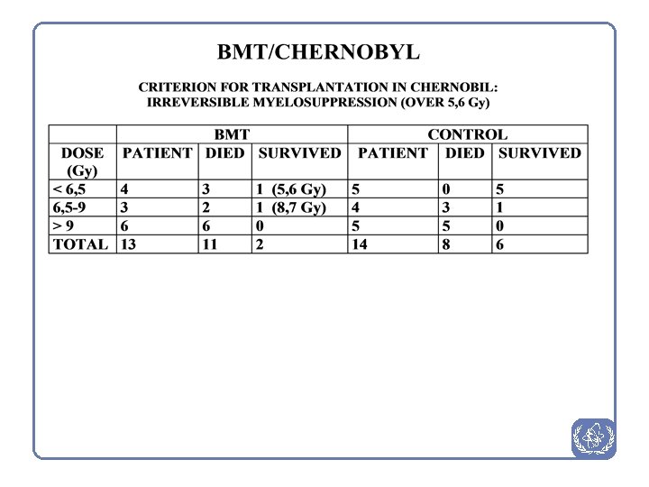 l In 1987 -2000 14 in 106 confirmed ARS patients died for different reasons l Cause of death only in three cases (Myelodysplastic syndrome) may be associated with II-III degree of ARS n [Ref. : UNSCEAR Report 2000, Part II, Table 55, p. 542, United Nations, New York, 2000]