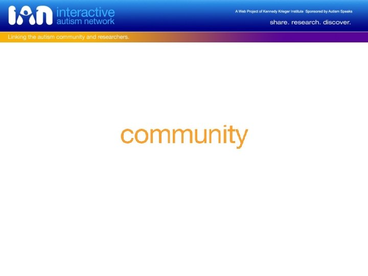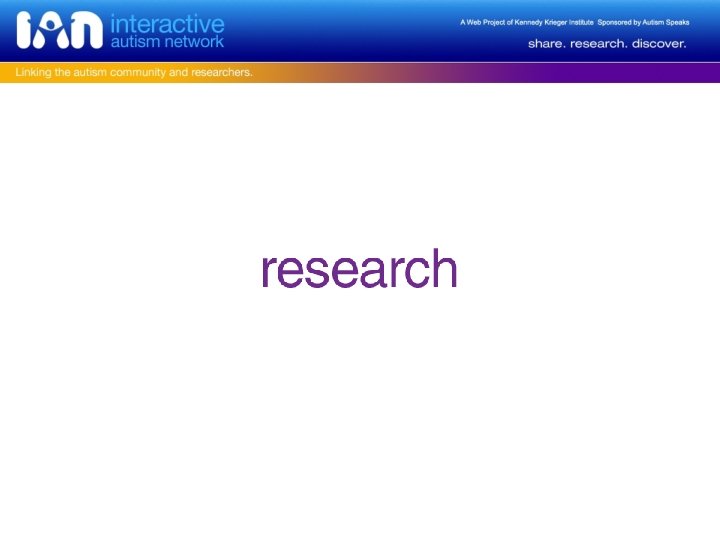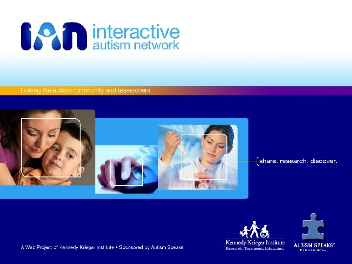 IAN Project • IAN Research --- Kiely Law, MD, MPH – Research Database collecting parent-provided information – Recruitment Registry matching families and research projects • IAN Community --- Connie Anderson, Ph. D – Information-rich library and online meeting place focused on ASD research • IAN Exchange --- Cheryl Cohen – Online collaborative environment supporting the exchange of knowledge and ideas