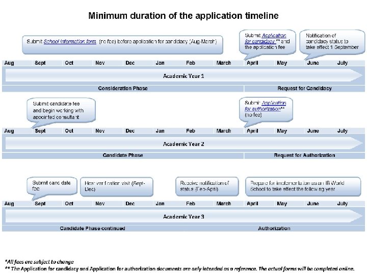 Candidate Fees USD 4, 000* with the Application for candidacy and USD 9, 500* payable annually commencing from September / March, after the submission of application for candidacy (during a normal authorization process this fee is paid twice) What you receive: ü Ongoing counseling services by IB Americas ü Reading and feedback for applications ü Subscription to the online curriculum centre for all school staff ü A two-day on-site consultation visit ü The remote services of a consultant for up to 20 hours ü A two-day on-site verification visit *All fees are subject to change