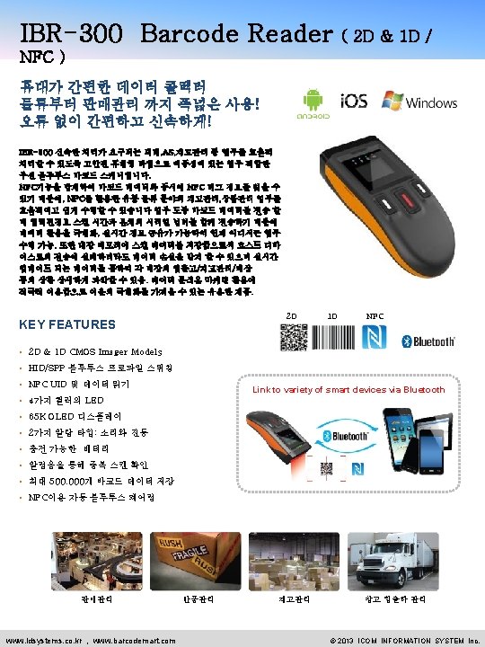 IBR-300 Specifications Synchronization PHYSICAL CHARACTERISTICS 데이터를 본체에 저장, 연결 기기로 전송 및 동기화 Dimensions 46 mm W x 95. 8 mm L x 26. 5 mm H Weights Under 115 g (including battery) Symbologies Barcode Module 1 D&2 D CMOS Imager 대부분의 주요 2 D and 1 D 데이터. OCR Display 0. 95 Inch 65 k OLED(96 x 64) Buttons Scan key, Left key, Right key, Reset LEDs 5 LED (4 color) INTERFACES • PC 프로그램, 스마트폰 어플리케이션 제공 • 재고/입고/출고/실사 관리 기능 패키지 구성 Bluetooth Version 2. 1 + EDR, Class 2, HID/SPP Profile USB Micro USB FUNCTIONALITY Memory 어플리케이션 • 바코드스캐너 1대 • USB 케이블 어댑터 1개 • 목걸이 1개 인증 8 M Serial Flash Memory, 1 MB Flash CE, FCC, TELEC, VCCI, KC 128 KB RAM MCU STMICRO STM 32 F 205 RBT 6 NFC : Option NFC Protocol ISO 14443 A, ISO 14443 B, ISO 15693, Mifare 1 K, Feli. Ca, Tag-it, Jewel NFC Chipset TRH-033 MS of 3 Alogics (Korea) NFC Function NFC Read, P 2 P, Tag Emulation BATTERY Battery DC 3. 7 V, 720 m. Ah, Li-polymer Operating Time 약 8시간 Charging Micro USB 커넥터 충전 문의처 User Environment 아이콤정보시스템 Operation Temp 0~40℃ Storage Temp 0~40℃ 서울시 구로구 구로동 212 -1 에이스트윈타워1차 603호 Humidity 5~85%(None-condensing) TEL: +82 -2 -861 -1175 , FAX: +82 -2 -861 -1176 Drop Spec 1. 5 m without rubber case Water/dustproof Upper IP 54 EMAIL: icomis@idsystems. co. kr www. idsystems. co. kr , www. barcodemart. com ICOM INFORMATION SYSTEM Since 1999 위 사양은 제조사의 사정에 의해 고지 없이 변경될 수 있습니다. © 2013 ICOM INFORMATION SYSTEM Inc.