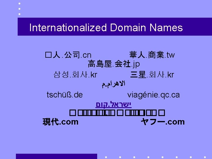 The New Standard - 1 Punycode <draft-ietf-idn-punycode-03. txt> • It uniquely and reversibly transforms a Unicode string into an LDH (Letter, Digit, Hyphen) string • ASCII Compatible Encoding (ACE) • Some compression to produce shorter string • Example: 新加坡 = xn--3 bs 3 aw 5 wpa 2 a