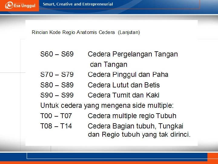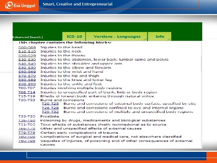 KEMAMPUAN AKHIR YANG DIHARAPKAN pada Pertemuan I 1. 2. 3. 4. Menguraikan diagnosis dan masalah kesehatan cedera dan gangguan lain akibat sebab luar presisi, tepat dan benar Menunjukkan alokasi anatomi cidera/ injuri Membedakan Kasus dengan kode ICD S dan T Membedakan injuri/ cedera karena kecelakaan lalu lintas dan non lalu lintas