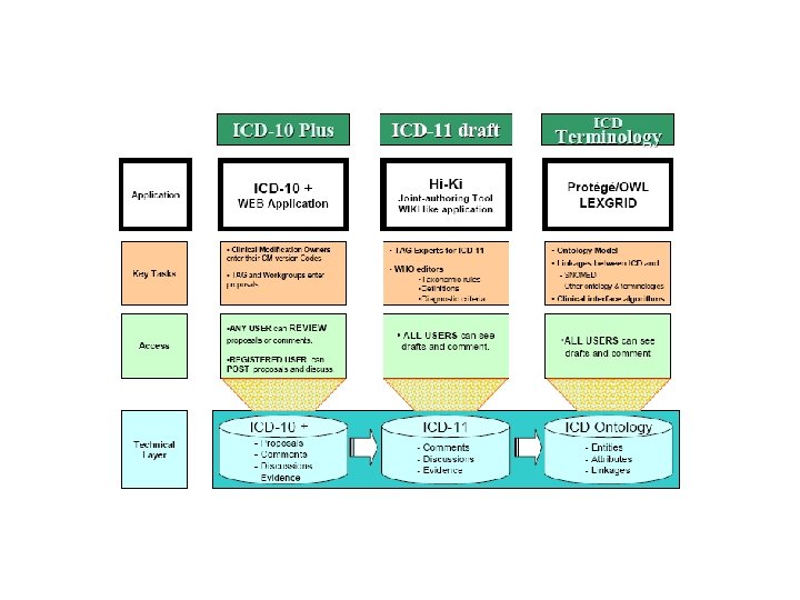 Use cases – Several versions of ICD-11, each specific to a major type of use • Certainly: Mortality and Morbidity • Others foreshadowed: – – Primary health care Research Lower resource settings etc. – Each will be specified in terms of the same ‘foundation layer’ • Relationship between use-case versions is less clear