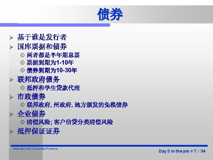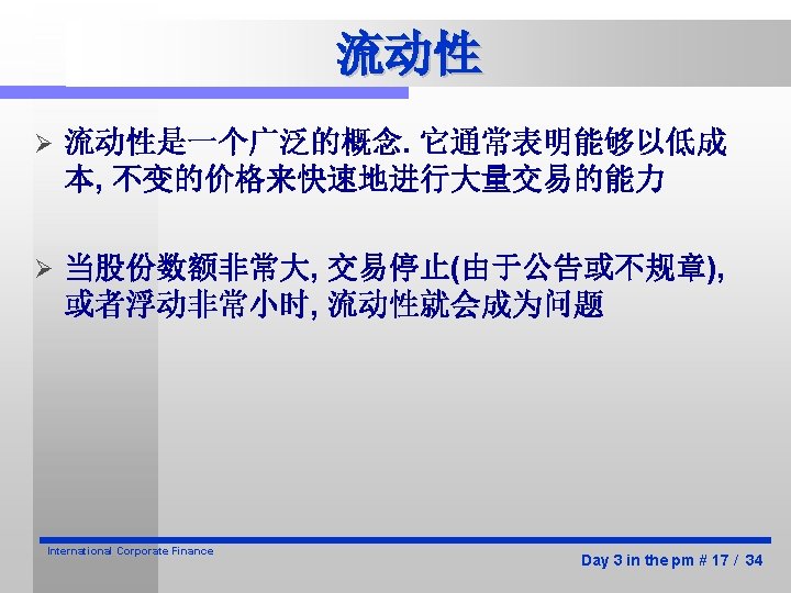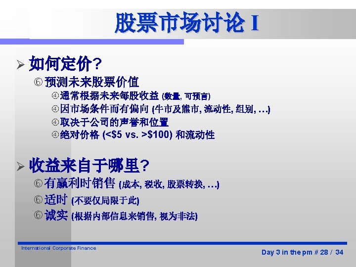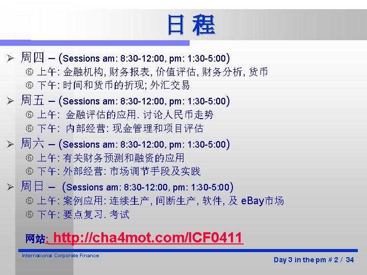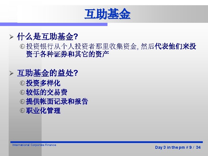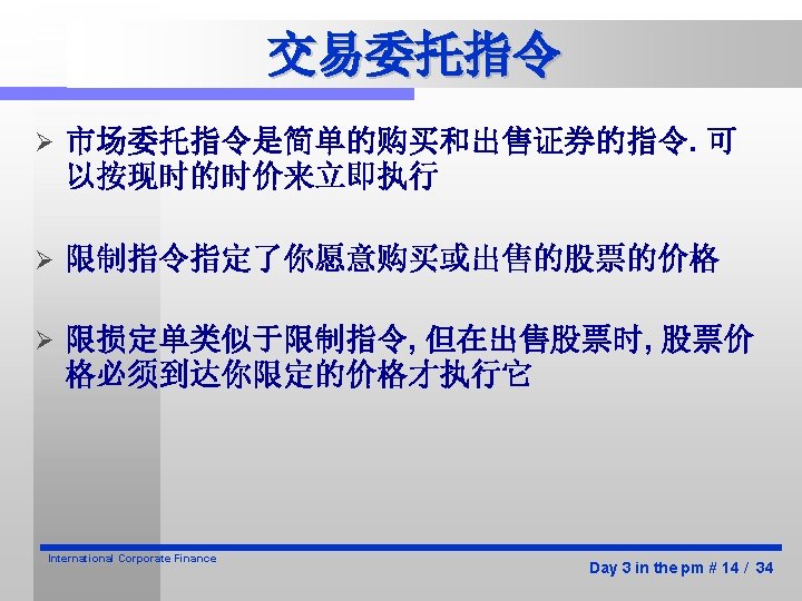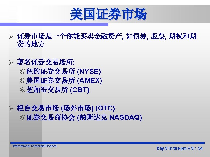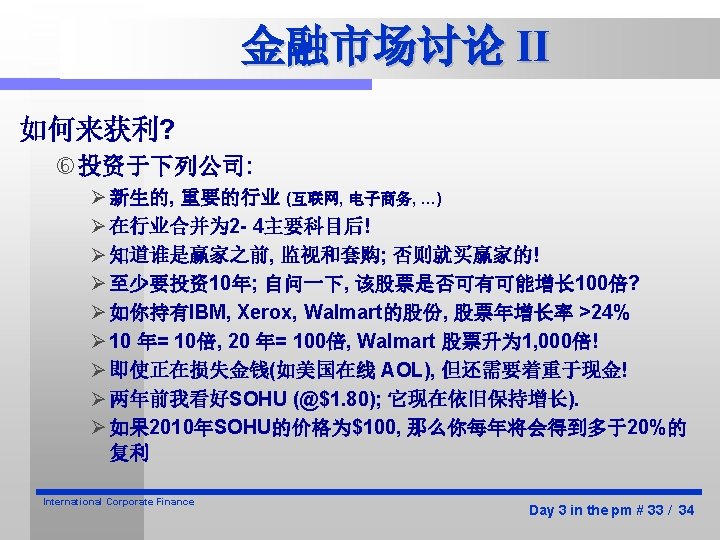 ICF International Corporate Finance Day 3 in the Slides: 36 Download presentation 跨国公司理财(ICF) International Corporate Finance Day 3 in the am # 1 / 34 货币市场 具: 短期的, 可流动的, 低风险的, 流行的 International Corporate Finance Day 3 in the pm # 5 / 34 美国债权人分布图 International Corporate Finance Day 3 in the pm # 8 / 34 纽约证券交易所上市条件 International Corporate Finance Day 3 in the pm # 11 / 34 纳斯达可上市条件 International Corporate Finance Day 3 in the pm # 12 / 34 环球金融市场 International Corporate Finance Day 3 in the pm # 18 / 34 新生市场 International Corporate Finance Day 3 in the pm # 20 / 34 美国股票托存收据的购买步骤 International Corporate Finance Day 3 in the pm # 22 / 34 道琼斯 – 日经 1976 -1989 International Corporate Finance Day 3 in the pm # 23 / 34 道琼斯 – 日经 1989 -2002 International Corporate Finance Day 3 in the pm # 24 / 34 收益率与每股收益变化率 International Corporate Finance Day 3 in the pm # 25 / 34 日经 90 s 与道琼斯 30 s International Corporate Finance Day 3 in the pm # 26 / 34 日元对美元 1942 -2001 International Corporate Finance Day 3 in the pm # 27 / 34 不同分组的长期汇报 International Corporate Finance Day 3 in the pm # 29 / 34 收益率 1870 -2002 International Corporate Finance Day 3 in the pm # 30 / 34 收益率分布 International Corporate Finance Day 3 in the pm # 31 / 34 收益率与每股收益变化率 International Corporate Finance Day 3 in the pm # 32 / 34 结束语 Ø 问题与解答 Ø 再次感谢 课程讲义见: http: //cha 4 mot. com/ICF 0411 International Corporate Finance Day 3 in the pm # 34 / 34 Kondratieff Long Wave International Corporate Finance Day 3 in the pm # 35 / 34 Kondratieff Cycle International Corporate Finance Day 3 in the pm # 36 / 34