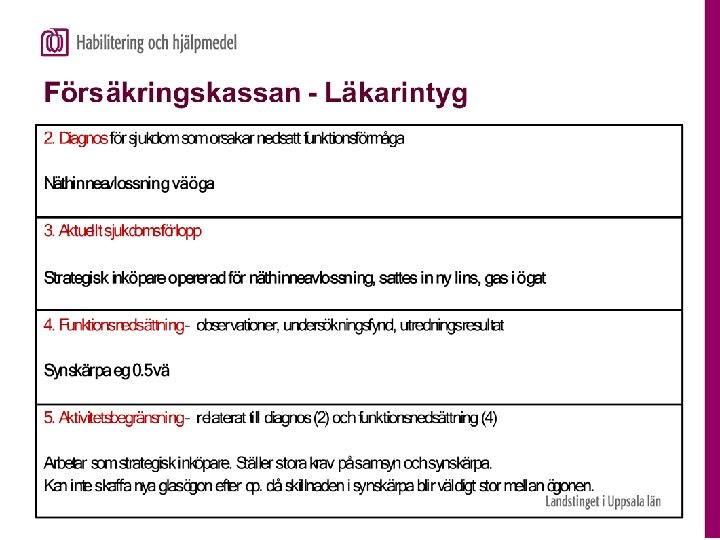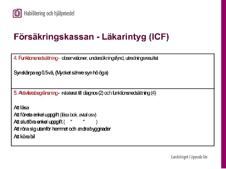 Intyg (anpassning av bil) UTAN ICF Eva har en kronisk neurologisk sjukdom, sannolikt MS. Hon har haft symtom och nuvarande begränsningar i funktion ungefär 4 år. Det är sannolikt att tillstånd, symtom, nedsättningar av funktion och förmåga blir bestående. MED ICF Eva har multipel skleros (MS). Evas sjukdom är varaktig. Hon klarar inte att åka kollektivt för att handla eller delta i sociala aktiviteter. Att inte kunna åka buss gör henne isolerad i hemmet och de fysiska och sociala förmågorna påverkas negativt. Hon har nedsatt gång- och rörelseförmåga och kan inte gå 500 meter till närmaste busshållplats. Hon använder rollator, som hon inte orkar lyfta upp på bussen.