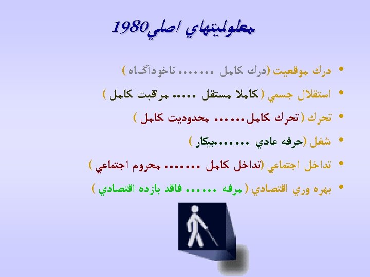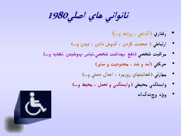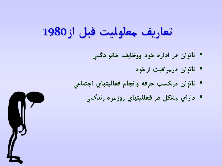 ﺳﺎﺑﻘﻪ ICIDH • ICIDH-2 Beta-2 Draft For Filed Trials Overall Plan (August/1999) • ICIDH-2 CHECKLIST Beta-2 Draft (December/1999) • ICIDH-2 (Beta-2 Draft) Research Project Initiation Document (February/2000) • ICIDH-2: International Classification of Disability and Health PREFINAL DRAFT (October/ 2000)