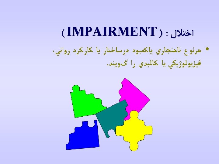 • Impairment: In the context of health experience, an impairment is any loss or abnormality of psychological, physiological, or anatomical structure or function • Disability: In the context of health experience, a disability is any restriction or lack (resulting from an impairment) of ability to perform an activity in the manner or within the range considered normal for a human being • Handicap: In the context of health experience, a handicap is a disadvantage for a given individual, resulting from an impairment or a disability, that limits or prevents the fulfillment of a role that is normal (depending on age, sex, and social and cultural factors) for that individual