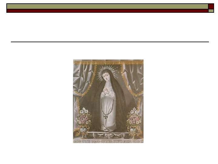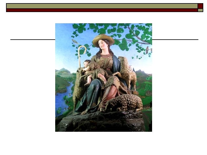 Los nombres de María: advocaciones o Madre de Dios, Theotokos n n o Inmaculada Concepción n n o o o o La luna a los pies Las letanías y sus símbolos Virgen de la O, de la Esperanza, de la Expectación Virgen de la Leche Virgen Dolorosa n o Trono de Dios Virgen en Majestad, Maestá Piedad Soledad Virgen de la Misericordia, de los Desamparados Virgen del Rosario Virgen del Perpetuo Socorro La Virgen Niña Divina Pastora