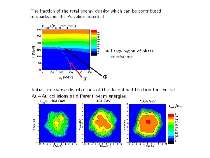 connect hadronic and quark degrees of freedom order parameter of the phase transition confined phase deconfined phase effective potential for Polyakov loop, fit to lattice data U = ½ a(T) ΦΦ* + b(T) ln[1 – 6 ΦΦ* + 4 (ΦΦ*)3 – 3 (ΦΦ*)2] a(T) = a 0 T 4 + a 1 µ 4 + a 2 µ 2 T 2 baryonic and quark mass shift δ m. B ~ f(Φ) δ mq ~ f(1 -Φ) quarks couple to mean fields via gqσ, gqω minimize grand canonical potential V. Dexheimer, SWS, PRC 81 045201 (2010) Ratti et al. PRD 73 014019 (2006) Fukushima, PLB 591, 277 (2004)