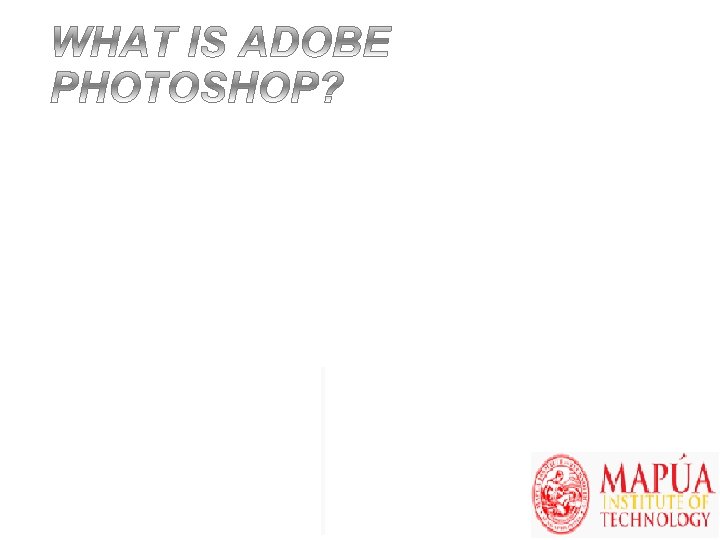 ADOBE PHOTOSHOP • image editing software • developed/manufactured by Adobe Systems Inc. • considered one of the leaders in photo editing software • allows users to manipulate, crop, resize, and correct color on digital photos • popular amongst professional photographers and graphic designers • A Raster graphics editor for Windows and OS X