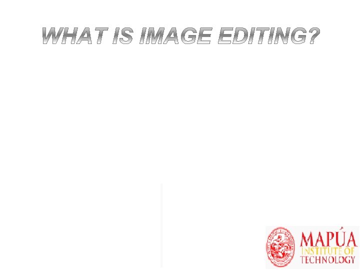 WHAT IS IMAGE EDITING TECHNIQUES ? • Image editing encompasses the processes of altering images, whether they are digital photographes, traditional photochemical photographs, or illustrations there are several techniques that most people commonly use to edit images such as , cropping , leveling , embossing and many more.
