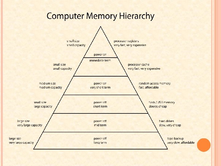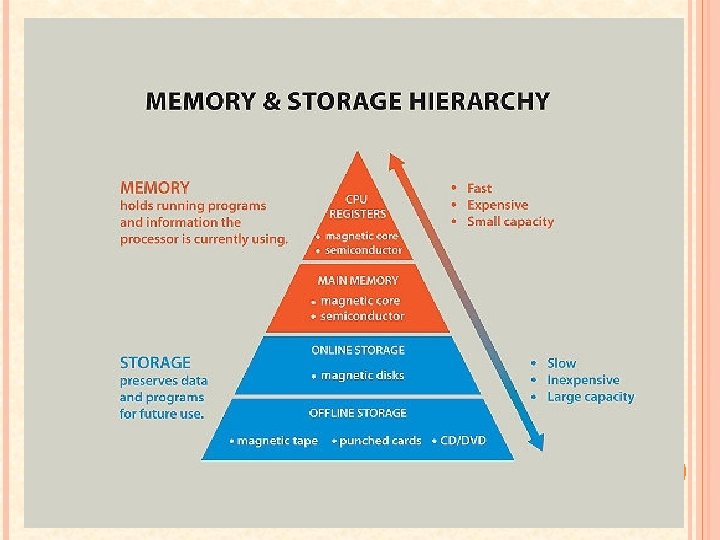 DATA STORAGE HIERARCHY In computer architecture the memory hierarchy is a concept used to discuss performance issues in computer architectural design, algorithm predictions, and lower level programming constructs involving locality of reference. The memory hierarchy in computer storage separates each of its levels based on response time. Since response time, complexity, and capacity are related, the levels may also be distinguished by their performance and controlling technologies. There are four major storage levels. Ø Internal – Processor registers and cache. Ø Main – the system RAM and controller cards. Ø On-line mass storage – Secondary storage. Ø Off-line bulk storage – Tertiary and Off-line storage. Ø This is a general memory hierarchy structuring. Many other structures are useful. For example, a paging algorithm may be considered as a level for virtual memory when designing a computer architecture, and one can include a level of nearline storage between online and offline storage.