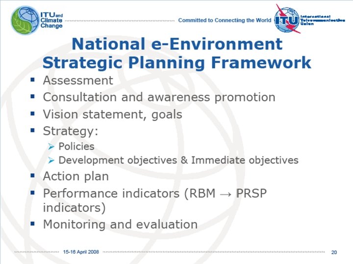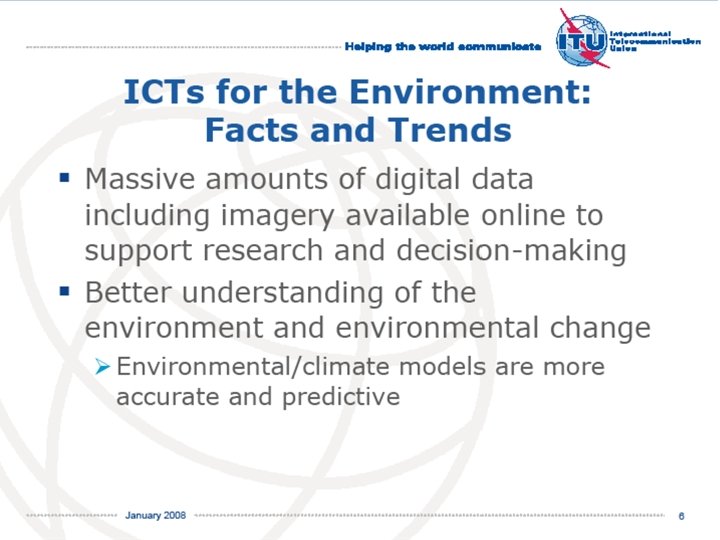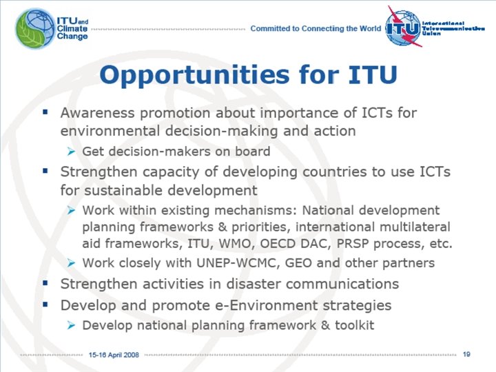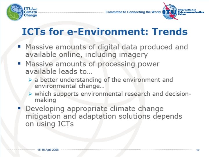 ICTs for managing the environment • To help observe, understand learn about the environment • To share information and data as well as processing power: – Data warehouses, clearing houses and data/information servers; environmental networks and grids; etc. • To facilitate and help coordinate environmental decision-making and management: – including environmental early warning, risk assessment, mitigation and management, etc. • To help mitigate environmental impact.