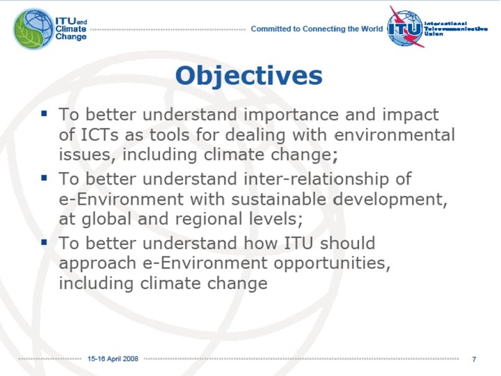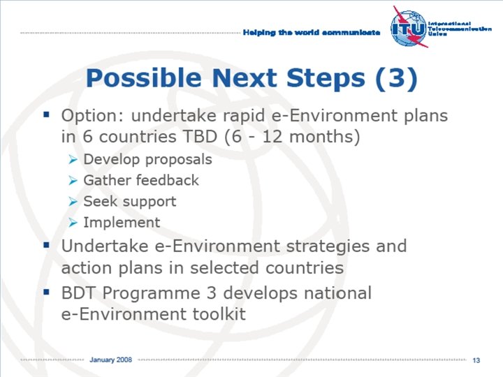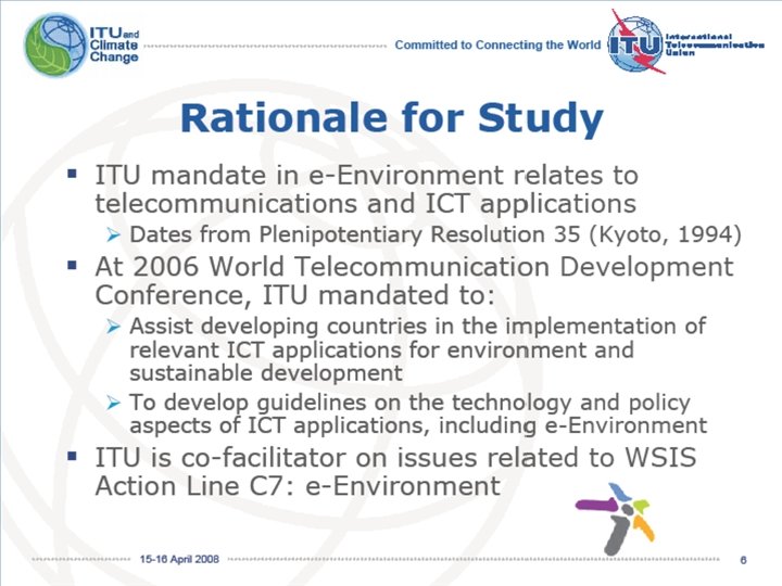 ICTs for e-Environment Report • Objective: – Provide guidelines for developing countries on the use of ICTs for better management and protection of the environment as a key part of their development process, with particular focus on climate change • Examines six areas of ICT use: – – – Environmental Observation Analysis Planning Management and Protection ICT Mitigation and Capacity Building http: //www. itu. int/ITU-D/cyb 44