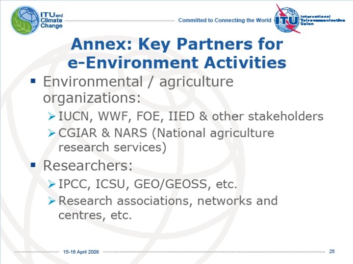 Key applications • Clearing house mechanism (CHM) for environmental agreements: biodiversity, climate change, etc. • Online Access to Research in the Environment (OARE): Yale, UNEP, major publishers (PPP)