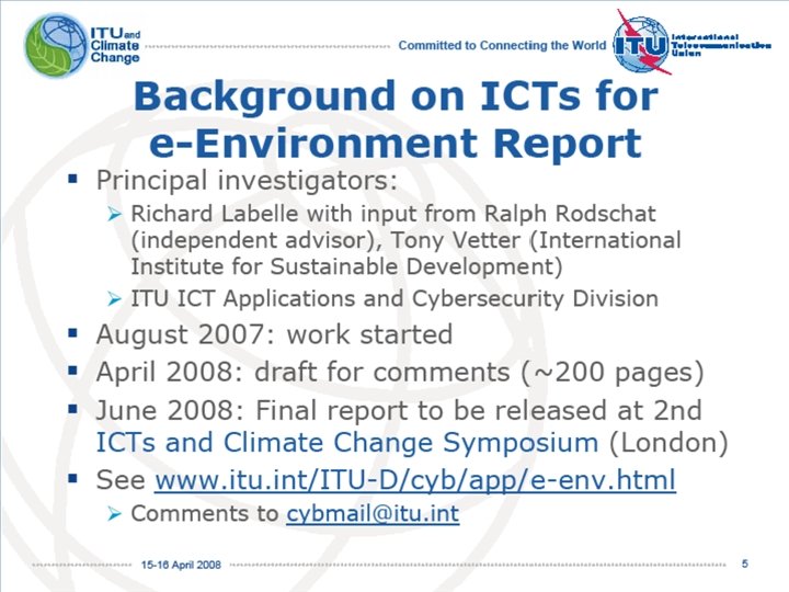 ICTs for e-Environment: adapting to climate change and resource depletion Richard Labelle (rlab@sympatico. ca) ICT Strategist & ITU-D Consultant The Aylmer Group Gatineau, Canada