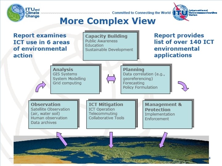 Key ICT capabilities • Increasingly powerful micro processors: – Computational power as well as increasingly intelligent algorithms for modeling of environmental systems; • Geographic information systems (GIS): – For visualization and interpretation of the datasets from observation systems; • Increasing bandwidth and networked communications, processing and storage capabilities: – Facilitate data sharing and undertaking computationally-intensive tasks through the use of Grid and Cloud computing. • Satellite and direct sensor technology applications: – For recording and storing massive amounts of geographical and historical information with increasing resolution and geographic coverage.