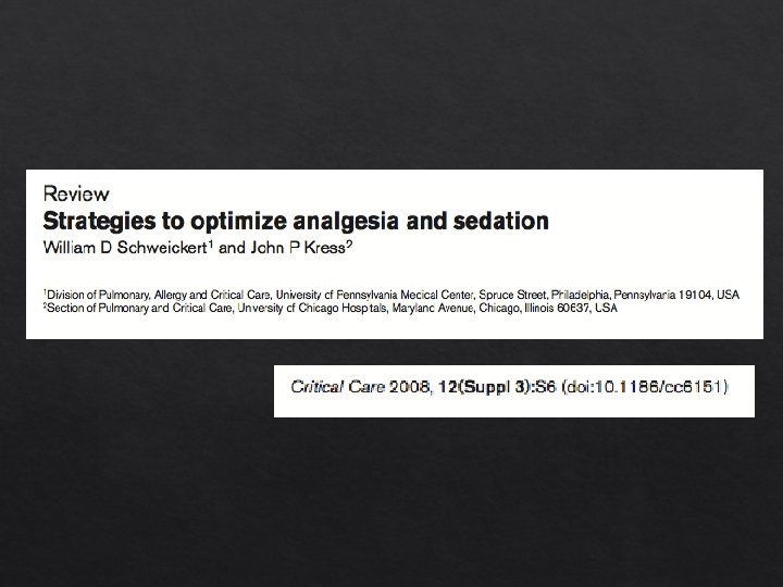 Analgesia Therapy Opioids – the mainstay of pain treatment in the ICU Selection of specific agent depends on each agent’s pharmacology and side effect profile Guidelines recommend the use of fentanyl, hydromorphone, or morphine if an IV opioid analgesic is required