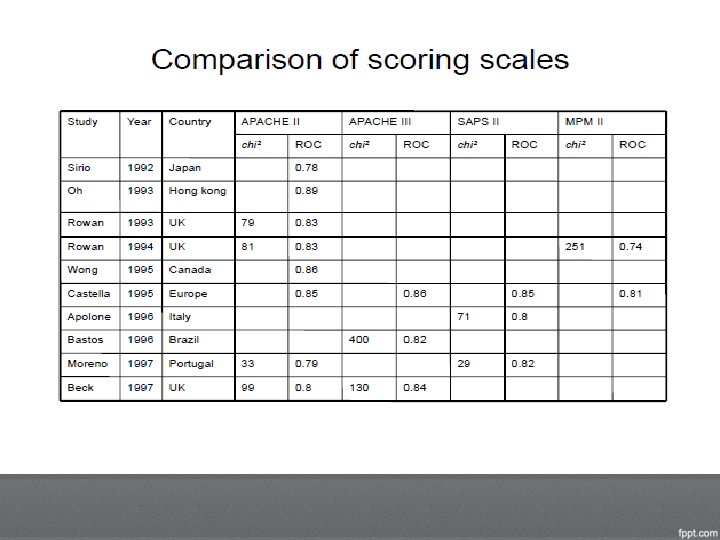 Which score to use? ► APACHE, SAPS, MPM → only of historic significance ► APACHE II → most widely used in USA ► SAPS II → commonly used in Europe ► APACHE III → not in public domain ► SAPS III, APACHE IV → better design ► MODS & LODS → uncommonly used