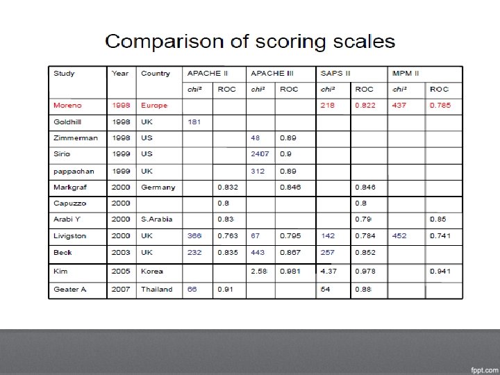 APACHE score ROC Prediction at 50%probability APACHE II 0. 85 85. 5 APACHE III version (H) 0. 90 88. 2 48. 7 APACHE III version (I) Unpublished 24. 2 APACHE III (H) in 2003 -04 cohort Unpublished 24. 2 Calibration