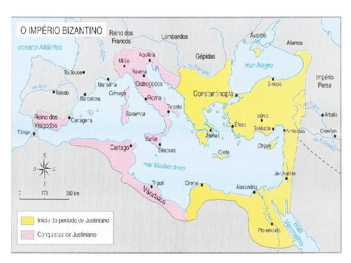 • Também chamado de Império Romano do Oriente é a continuidade da Antiguidade Greco-Romana na Idade Média. • Enquanto os territórios do Império Ocidental eram invadidos pelos “bárbaros germânicos”, a cidade grega de Bizâncio, depois chamada de Constantinopla, manteve-se intacta, tornando-se a capital da parte oriental do Império Romano a partir do ano 330, sob o governo do Imperador Constantino, uma situação oficializada em 395 com a divisão formal do Império Romano pelo Imperador Teodósio. • Os Territórios do Império Bizantino em seu auge eram: Ásia Menor (atual Turquia, aonde situava-se a capital, Constantinopla); Grécia; Síria-Palestina; parte da Mesopotâmia; Egito; depois noroeste da África, Península Itálica e o sul da Península Ibérica.