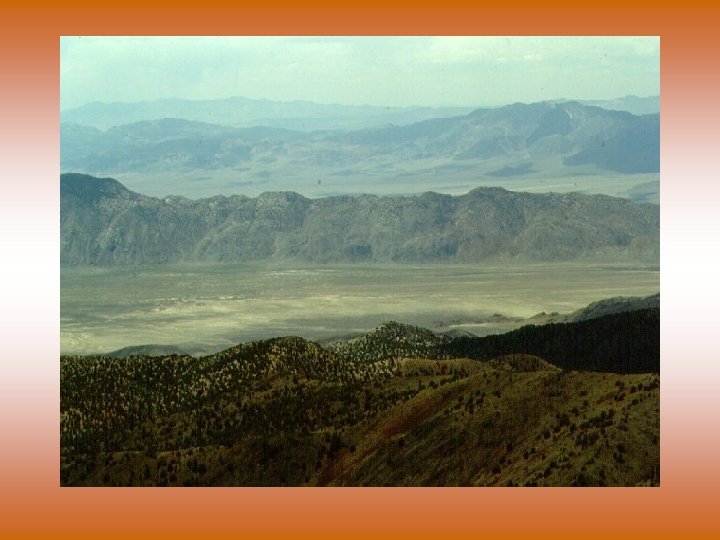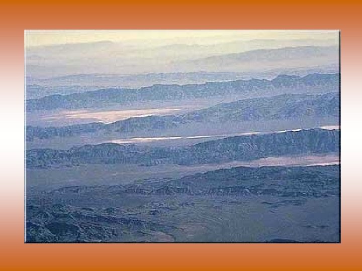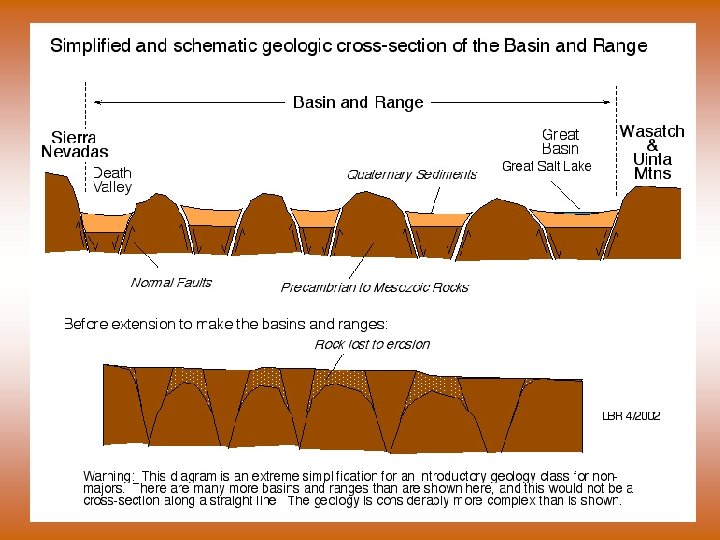 Basin and Range • A series of relatively parallel fault lines • Results in fault block mountains far enough apart that wide basins exist between them • Broad valleys/basins fill in from massive deposits from the neighboring ranges