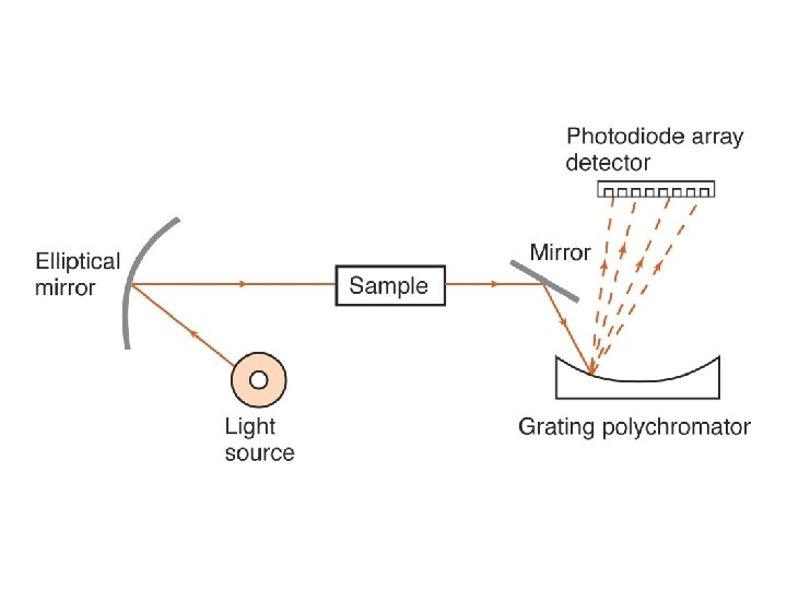 Diode arrays • Used with a grating which disperses the light so each ‘wavelength’ falls on a different photodiode. • Grating doesn’t move • No slits i. e. no monochromator • Spectral scans are very fast • Good as chromatography detectors or fast kinetics