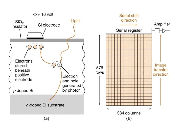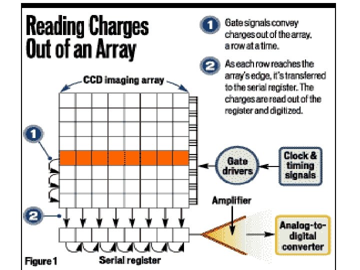 Charge-Coupled Detector • A CCD is an integrated-circuit chip that contains an array of capacitors that store charge when light creates e-hole pairs. The charge accumulates and is read in a fixed time interval. • CCDs are used in similar applications to other array detectors such as photodiode arrays, although the CCD is much more sensitive for measurement of low light levels.