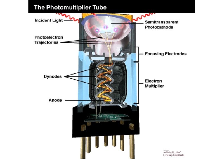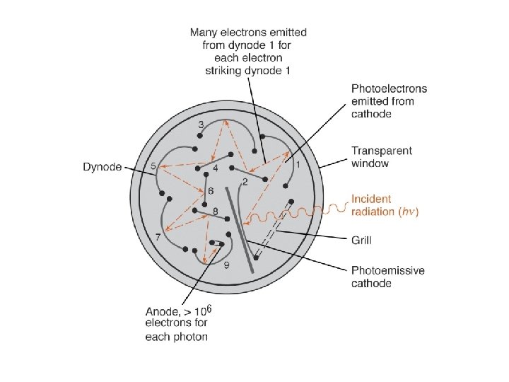 Photomultiplier tube • Current produced in phototube is small – requires amplification • Add a series of DYNODES between cathode and anode – each at a successively higher V • Each emits several electrons when hit by an energetic (accelerated) electron • Cascade effect • Big signal