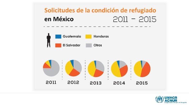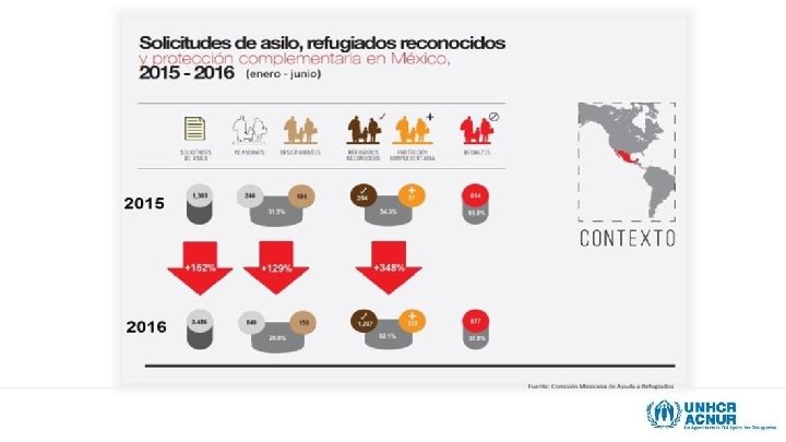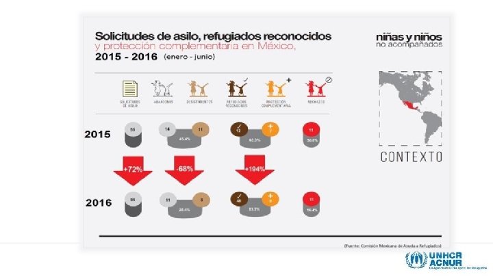 Papel de los Consulados en la identificación dado el contexto en México • Muchas de las personas con necesidades de protección internacional del TNCA suelen acudir sin miedo a sus consulados, siendo ésta una decisión personal. • Las autoridades consulares en México: • Tienen acceso a un número importante de sus connacionales en lugares poco accesibles. • Realizan acciones para el acceso al procedimiento y la protección internacional efectiva a sus connacionales y brindan asistencia humanitaria, así como orientación y asistencia consular. • Identifican y canalizan casos con necesidades de protección internacional, tanto a COMAR como al ACNUR. • Autoridades toman en consideración opinión de los consulados.