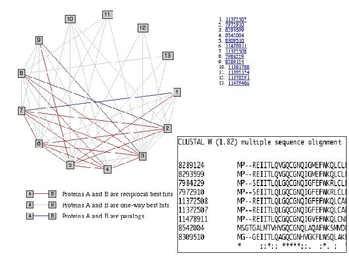 Comparing Ortho. MCL with INPARANOID ( two species) • INPARANOID clusters both orthologs and in-paralogs from two species by pairwise similarity – Find two-way best hits from pairwise similarity scores as main ortholog pair – Add additional orthologs (in-paralogs) from the same species for each main ortholog by comparing similarity scores between the main ortholog with putative in-paralogs with the score between the main ortholog pair – Resolve overlapping groups by merging, deleting, dividing them based on a set of rules • Ortho. MCL can cluster orthologs and in-paralogs from multiple species