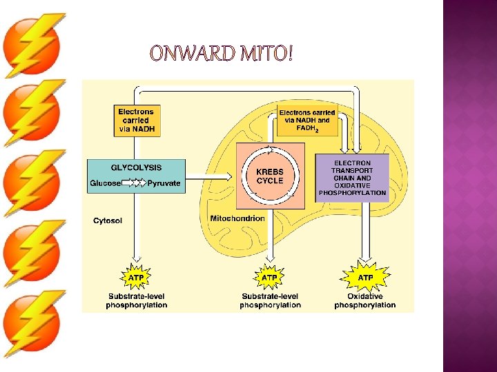 �Proteins built into inner mitochondrial membrane along cristae transport proteins & enzymes �In presence of O 2 �Ele- shuttled (by NADH & FADH 2)down ETC pump H+ to create H+ gradient → chemiosmosis!!! �yields ~36 ATP from 1 glucose!