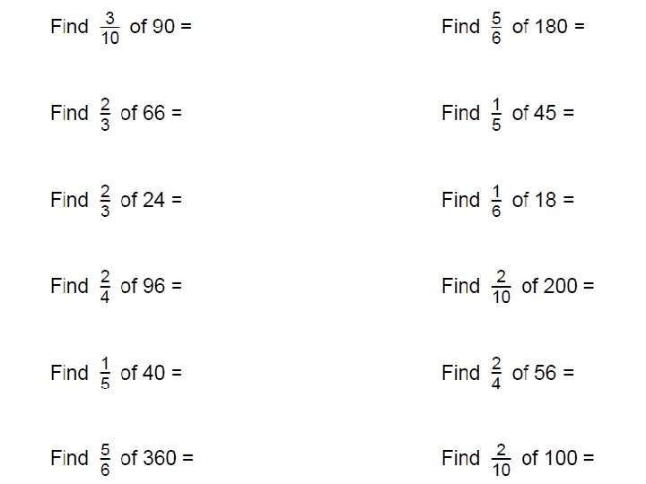 Fractions • The top number of a fraction is called the numerator • The bottom number of a fraction is called the denominator • To work out ¼ of 20: divide by the bottom number: • 20 ÷ 4 = 5 • To work out ¾ of 20: divide by the bottom number, times by the top number: • 20 ÷ 4 = 5, then 5 x 3 = 15