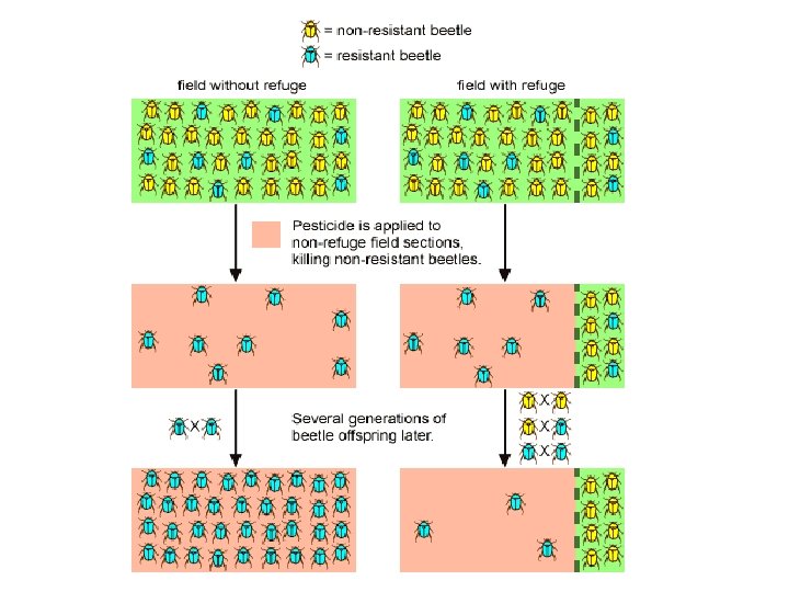 Pesticide Resistance • Over time, spraying large amounts of pesticide to get rid of pests usually makes the pest problem worse. • Pest populations may evolve resistance, the ability to survive exposure to a particular pesticide. • More than 500 species of insects have developed resistance to pesticides since the 1940 s.