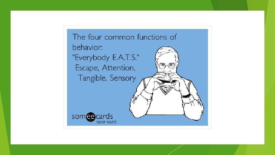 When-Why-What When a situation arises Why a behavior persists • We determine function of a behavior analyzing the data to determine what antecedents precede the behavior and what consequence(s) are maintaining it. • We call this the ‘function’ of behavior • What happens in the environment We can determine the function using our A-B-Cs…. Which will expand upon later in this powerpoint.