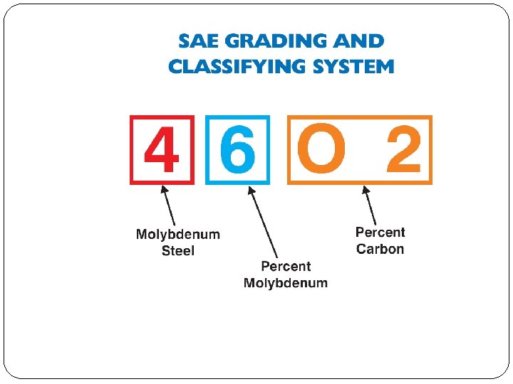 Obj. 4 Of the known elements, about 80 to 90 are technically considered metals. Ferrous metals—Metals whose chief ingredient is iron. Pig iron, cast iron, wrought iron, and steel are examples. Non-ferrous metals are those which have no iron and are made up of a single element. These are aluminum, copper, lead, magnesium, nickel, tin, tungsten, zinc, silver, and gold. Ferrous alloys are metals made up largely of ferrous materials but having other elements in sufficient quantities to change the ferrous characteristics. Non-ferrous alloys are made up of two or more nonferrous elements. Because steel varies in carbon content and alloying elements, a system to group it using standards established by the Society of Automotive Engineers (SAE) was developed. 2. In the SAE numbering system, the first digit indicates the general type of steel. The second digit indicates the percentage of the main alloy in the steel. The third and fourth digits show the percent of carbon in the steel in hundredths of one percent.