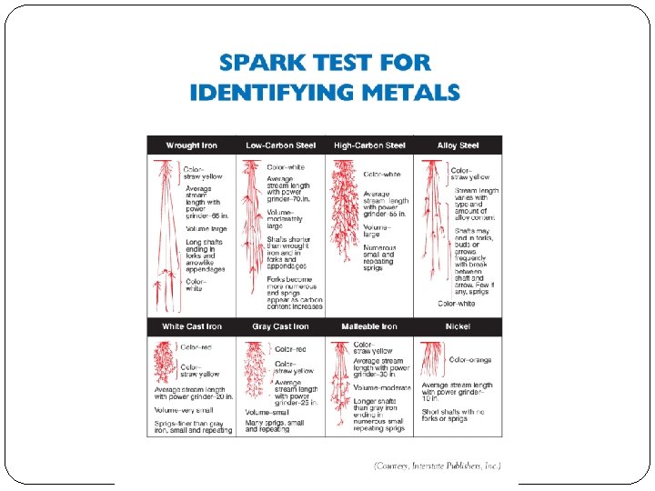 Obj. 5 Physical and chemical tests are used to determine the type of metal. The Appearance Test involves identification of a metal by its appearance and use. Color and appearance make certain metals such as copper, brass, and bronze easy to identify. The Magnetic Test involves identification of metal by the use of a magnet. The Chisel Test involves identification of metal by the use of a hammer and cold chisel. The Fracture Test involves identification of metal by fracturing the metal and observing the grain. The Flame Test involves identification of metals by applying a flame to them and watching what occurs. F. The Spark Test involves identification of metals by applying them to a grinding wheel and observing the spark that is generated. The color, shape, average length, and activity of the sparks are characteristics of the material being tested.