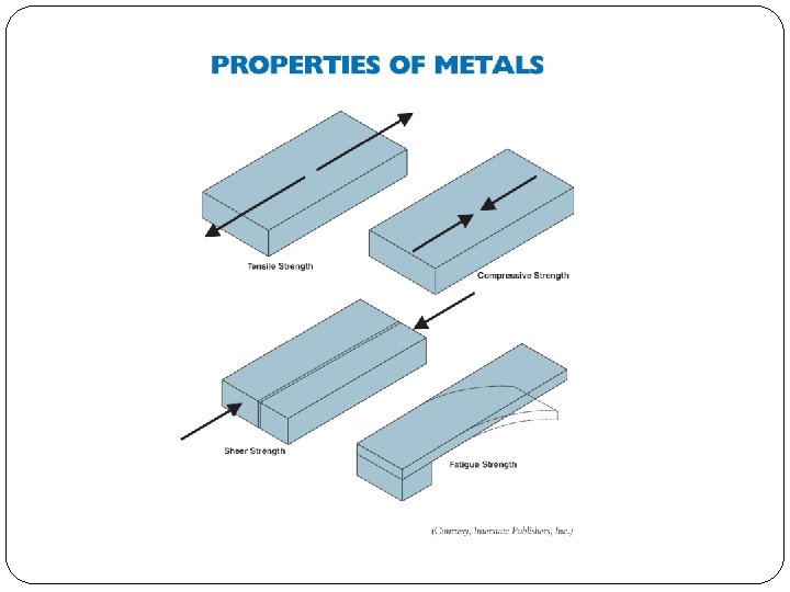Obj. 2 The distinct characteristics used to help identify a given metal are referred to as its properties. A. These characteristics include: brittleness, color, corrosion resistance, ductility, malleability, and strength. B. These properties can be categorized into seven broad classifications. 1. Mechanical properties are hardness, brittleness, ductility, percent elongation, toughness, wear, and strength. a. ____strength is the ability of a metal to resist being pulled apart. b. _____ strength is the ability of a metal to resist deformation by forces pushing it together. c. _____ strength is the ability of a metal to resist forces acting in opposite directions. d. _____ strength is the ability of a metal to take repeated loads without deforming. e. _____ strength is the ability of a metal to resist shock. f. _____ strength is the ability of a metal to bend without deforming or breaking.