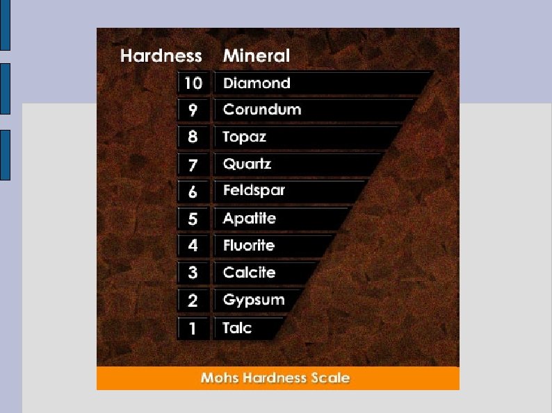 Identification by Tests The streak of a mineral is the colour of its powder, obtained by rubbing it on an unglazed white tile called a streak plate. The cleavage of a mineral is its tendency to split easily or separate along flat surfaces Some minerals tend to break along non-cleavage surfaces, called fracture http: //academic. brooklyn. cuny. edu/geology/grocha/mineral/cleavage. html The hardness of a mineral is its resistance to being scratched, diamond is the hardest, talc is the softest Friedrich Mohs devised the hardness scale from one to ten