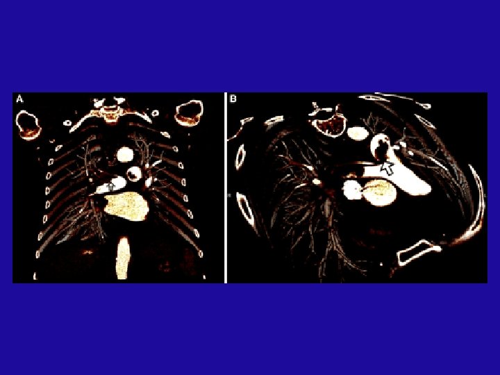 Risk stratification 4 - Spiral CT A- RV dilatation relative to LV size. RV dilatation and pulmonary vascular obstruction (≥ 40%) on chest CT is a predictor of eary death after APE (Circulation 2005; 235(3): 798 -803) B- Saddle or large proximal thrombus