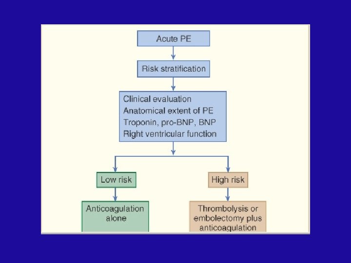 Summary (1) Risk Stratification based on Geneva score index (>4), ↑ S biomarkers, Echo signs of RVD and evidence of large thrombus burden on helical CT identification of patients for thrombolysis or thrombectomy Thrombolytic therapy is indicated in patients with massive PE, as shown by shock /or hypotension + RVD The use of thrombolytic therapy in patients with submassive PE (RVD without hypotension) is controversial. Thrombolytic therapy is not indicated in patients without right ventricular overload.