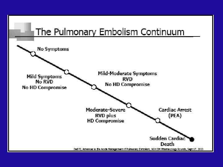 Syndromes of Acute Pulmonary Embolism Syndrome Presentation RVD Therapy Massive sob, syncope, cyanosis, ↓BP > 50% obst. of PV (v/q scan) +ve heparin + thrombolysis or thrombectomy Submassive Normal BP, > 30% obst of PV +ve heparin ± thrombolysis or thrombectomy Small to mod. Normal BP -ve heparin Pulmonary inf. Pleurisy (pain, rub), hemoptysis consolidation, s. periph. emboli rare heparin& NSAID Paradox. emb. Systemic embolization eg CVS rare heparin, defect closure Non-thrombotic embolism Air, Fat, Tumor, Amniotic fluid rare supportive