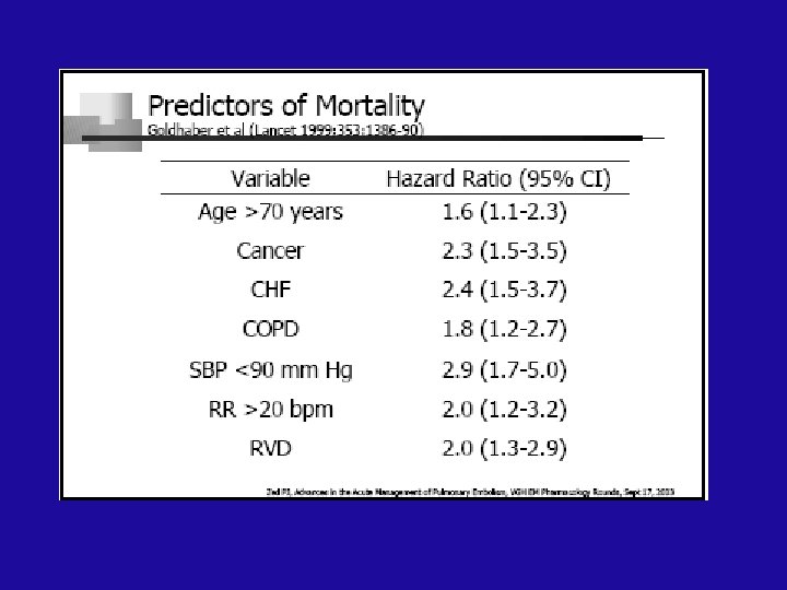 Epidemiology • • • >600, 00 patients/ year in the US 50, 000 -200, 000 deaths/ year in the US 3 -month MR is 15 -20% 10% of symptomatic PE are fatal at 1 hour 70% of symptomatic PE have DVT 50% of asymptomatic DVT have PE. Semin Vasc Med 2001; 1(2): 139 -46