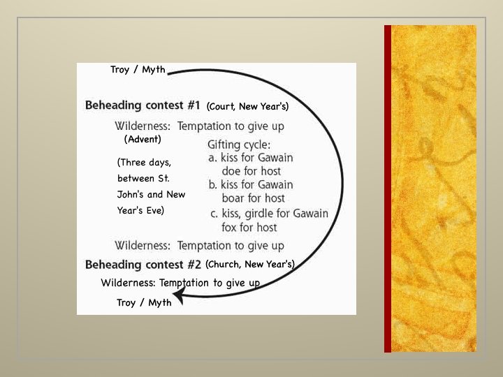 Gawain’s Liturgy (the Calendar) v. New Year’s Day, January 1 (Feast of the Circumcision) v. Lent (40 days before Easter) v[Easter /Probable Pentecost (lunar)] v. Michaelmas, September 29 th v. All Saint’s Day, November 1 v. Advent (four weeks prior to Christmas) v. Christmas Eve, December 24 v. St. John’s Day, December 27