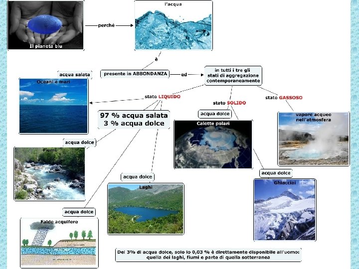 L’acqua presente sulla Terra è contenuta in 5 serbatoi principali: - Oceani e mari (97, 2%) -Ghiacciai (2, 15%) -Falde idriche (0, 61%) -Laghi e fiumi (0, 17%) -Atmosfera (0, 001%) -Esseri viventi (0, 00004%)