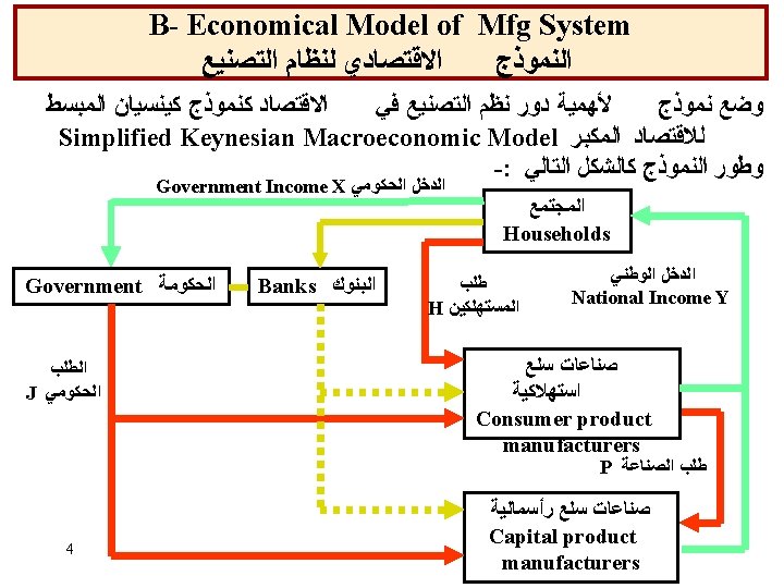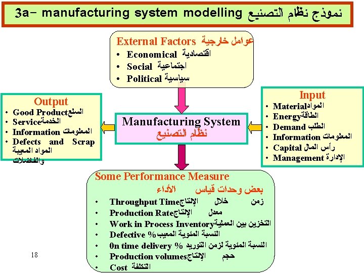 3 b- I/0 Models ﻣﺪﺧﻼﺕ ﻭﻣﺨﺮﺟﺎﺕ ﻧﻈﺎﻡ ﺍﻟﺘﺼﻨﻴﻊ ﻧﻤﺎﺫﺝ Manufacturing System Sale Fluctuations Raw material (Availability & cost) Business Environment Social Pressures Resources and Plans Production Rate Product Quality Delivery Profit Reputation a) Overall View (parnaby, 1978) Transformation INPUT: FACTORS OF PRODUCTION Objects Means (equipment) Labors Information 19 OUTPUT: GOODS Tangible intangible b) Basic meaning of manufacturing (Hitomi, 1979)