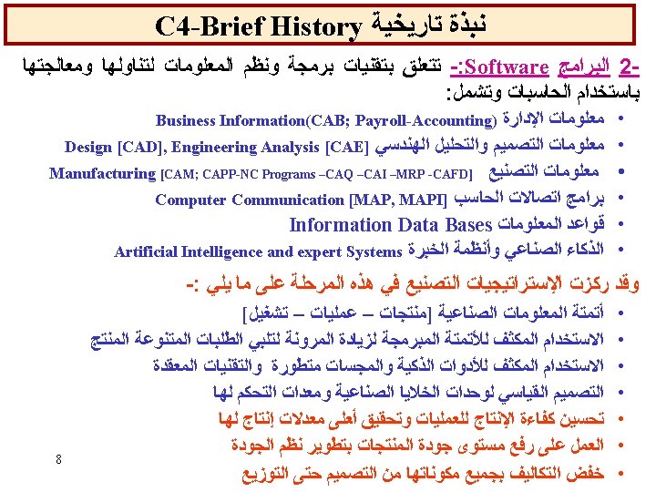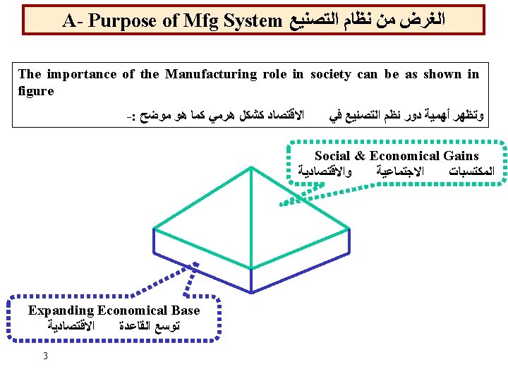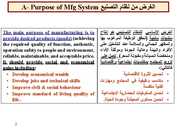 1 a- Manufacturing system : definition ﺘﻌﺮﻴﻒ ﺒﻨﻈﺎﻡ ﺍﻹﻨﺘﺎﺝ It is the production system which produces goods and parts assembled to them. ﻭﺍﻷﺠﺰﺍﺀ ﺍﻟﻤﺘﻤﻤﺔ ﻟﻬﺎ ﻹﻧﺘﺎﺝ ﺳﻠﻊ ﻣﻌﻴﻨﺔ ﻧﻈﺎﻡ It is a system composed of : ﻫﻮ ﻣﺠﻤﻮﻋﺔ ﻣﺮﻛﺒﺔ ﻣﻦ Ø Hardware composing the manufacturing facility (groups of equipments and technologies), ﺍﻟﻌﺘﺎﺩ ﺍﻟﺼﻨﺎﻋﻲ Ø Software composing manufacturing support ( group of programming tools and technologies), ﺑﺮﻣﺠﻴﺎﺕ ﻭﺍﺳﺘﺮﺍﺗﺠﻴﺎﺕ ﻭآﻠﻴﺎﺕ ﺍﻟﻌﻤﻞ Ø Peoples composing manning (group of operating and managing personals) ﺍﻷﻔﺮﺍﺩ It is divided to two categories: 9