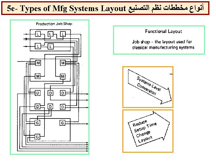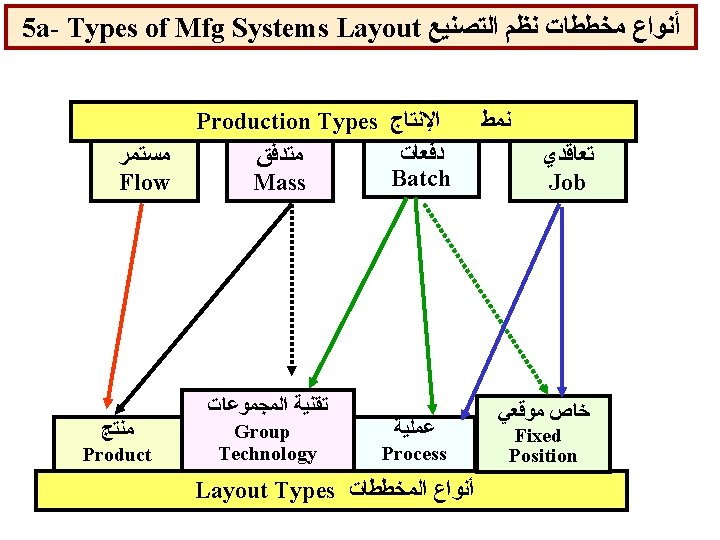 4 b- Types of Mfg Systems ﺃﻨﻮﺍﻉ ﻧﻈﻢ ﺍﻟﺘﺼﻨﻴﻊ b) Types of Production Characteristics L=Low, M=Medium, H=High Type of Production Flow Mass Batch Job shop Product Variety L L M H Quantity H H M L Prod. Rate H H M L Work In-process L L M H Cycle Time L L M-H H Unit Cost L L M-H H Flexibility L L M H Worker Skill L L M-H H Supervision L L M-H H Job instruction L L M H Pre-planning Once Few Complex Control Easy Fair Difficult Workload balance Difficult Fair Easy Equipment Types Special/General Fixed bath Mobile Product Process Characteristic Handling Types 23 Layout
